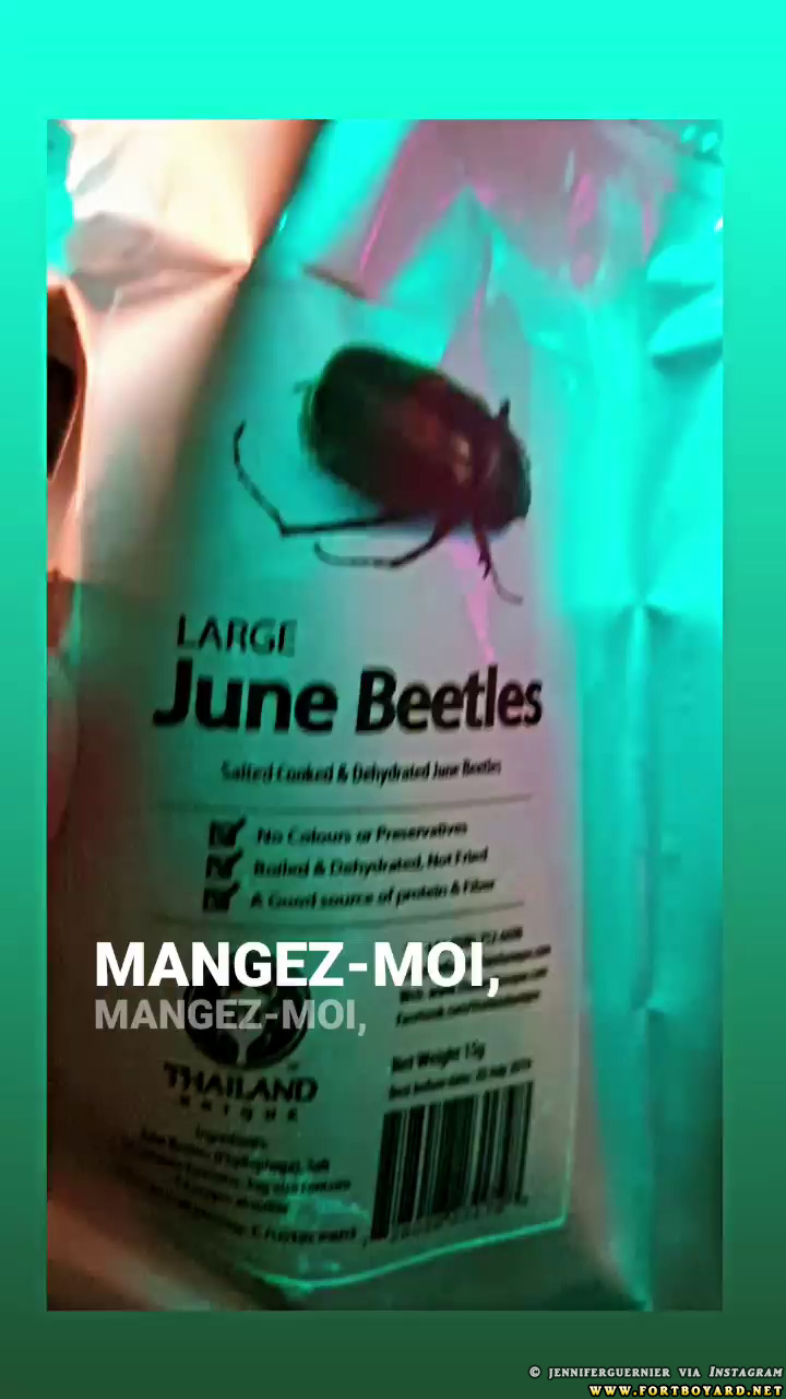 Commentaires : vers 21h, la maquilleuse Jennifer Guernier nous montre des insectes que les candidats vont sans doute devoir consommer chez Willy Rovelli.