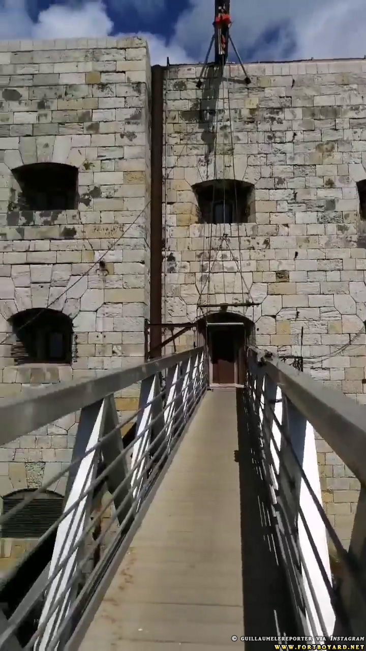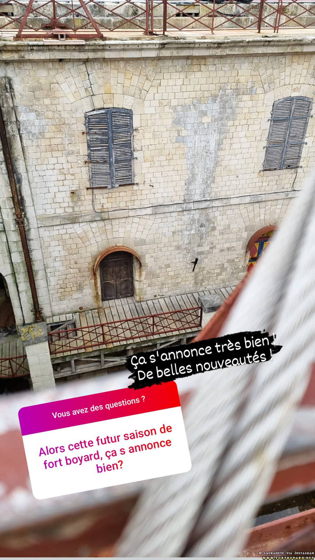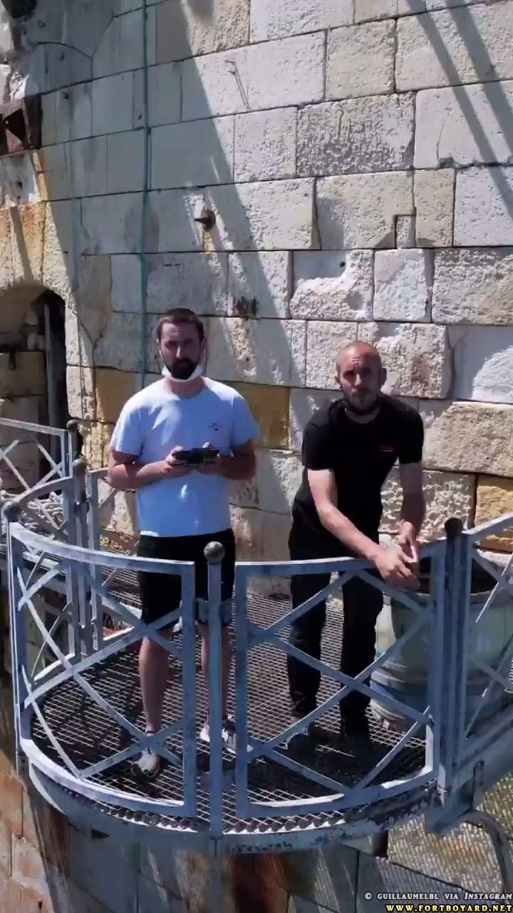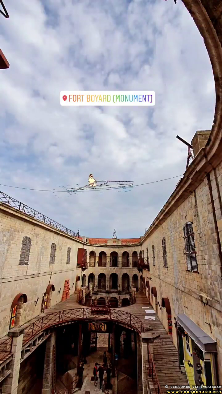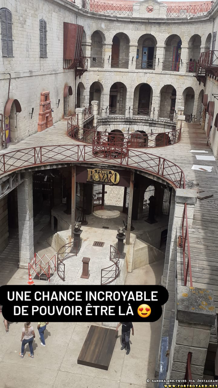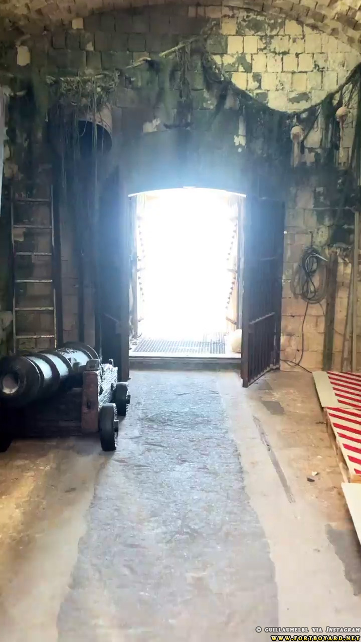 Commentaire : Guillaume Lebel, un cadreur, partage aujourd’hui quelques clichés de l’intérieur du Fort, rares depuis l’ouverture du Fort fin mars dernier, en story sur son compte Instagram. On peut notamment y voir le carrelet du Fort avec la présence d’un canon, mais surtout une vue extérieure qui nous permet de constater qu’une nouvelle aventure a été installée au sud-est du Fort, en léger contrebas de la vigie. Elle prend la forme d’une sorte de cabine rouge dans les airs. On remarque aussi ce qui semble être une sorte de cabine de téléphérique à l’arrière au niveau du parapet qui semble reliée à une structure permettant de la faire basculer...