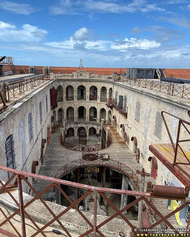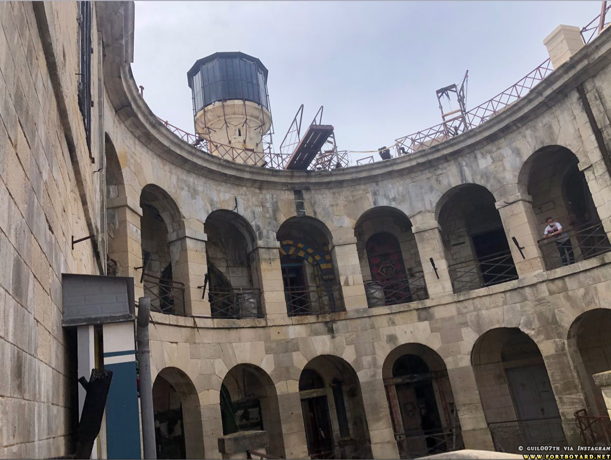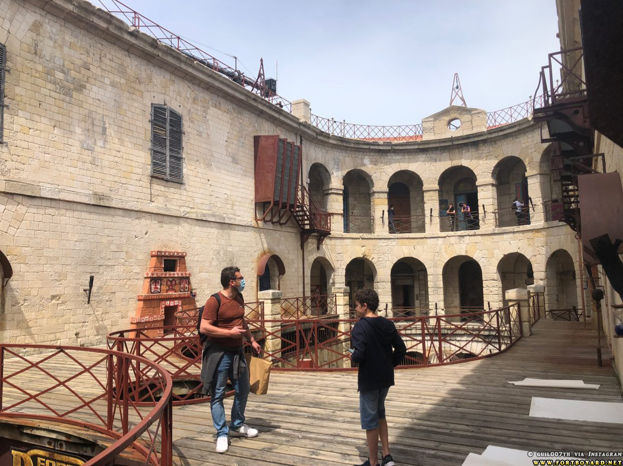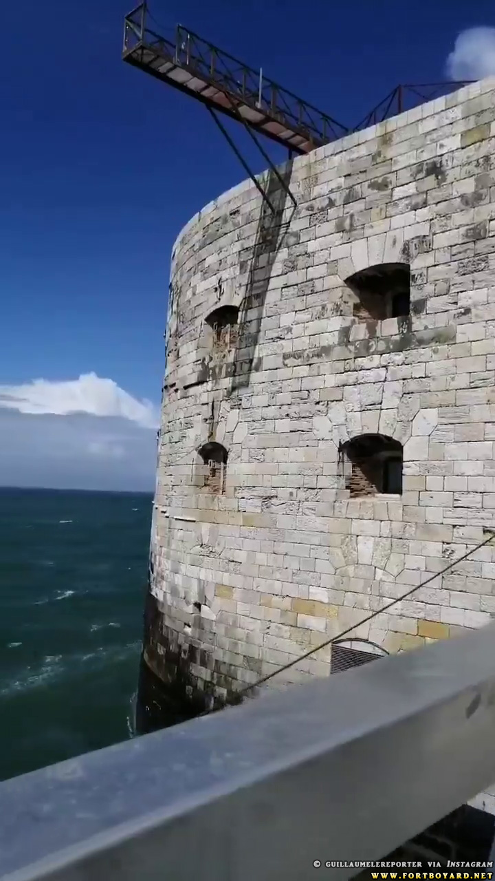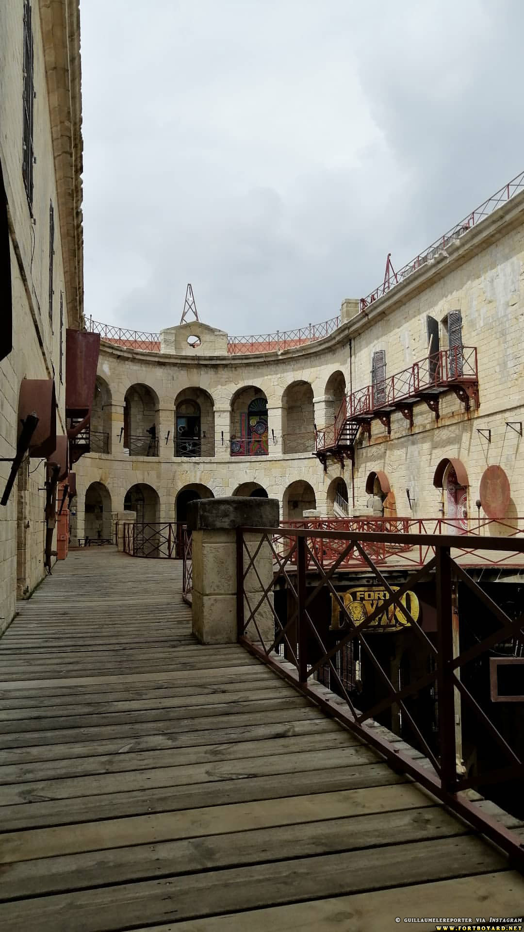Commentaire : Guillaume Lebel, un cadreur, partage aujourd’hui quelques clichés de l’intérieur du Fort, rares depuis l’ouverture du Fort fin mars dernier, en story sur son compte Instagram. On peut notamment y voir le carrelet du Fort avec la présence d’un canon, mais surtout une vue extérieure qui nous permet de constater qu’une nouvelle aventure a été installée au sud-est du Fort, en léger contrebas de la vigie. Elle prend la forme d’une sorte de cabine rouge dans les airs. On remarque aussi ce qui semble être une sorte de cabine de téléphérique à l’arrière au niveau du parapet qui semble reliée à une structure permettant de la faire basculer...