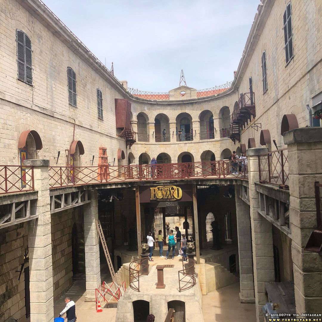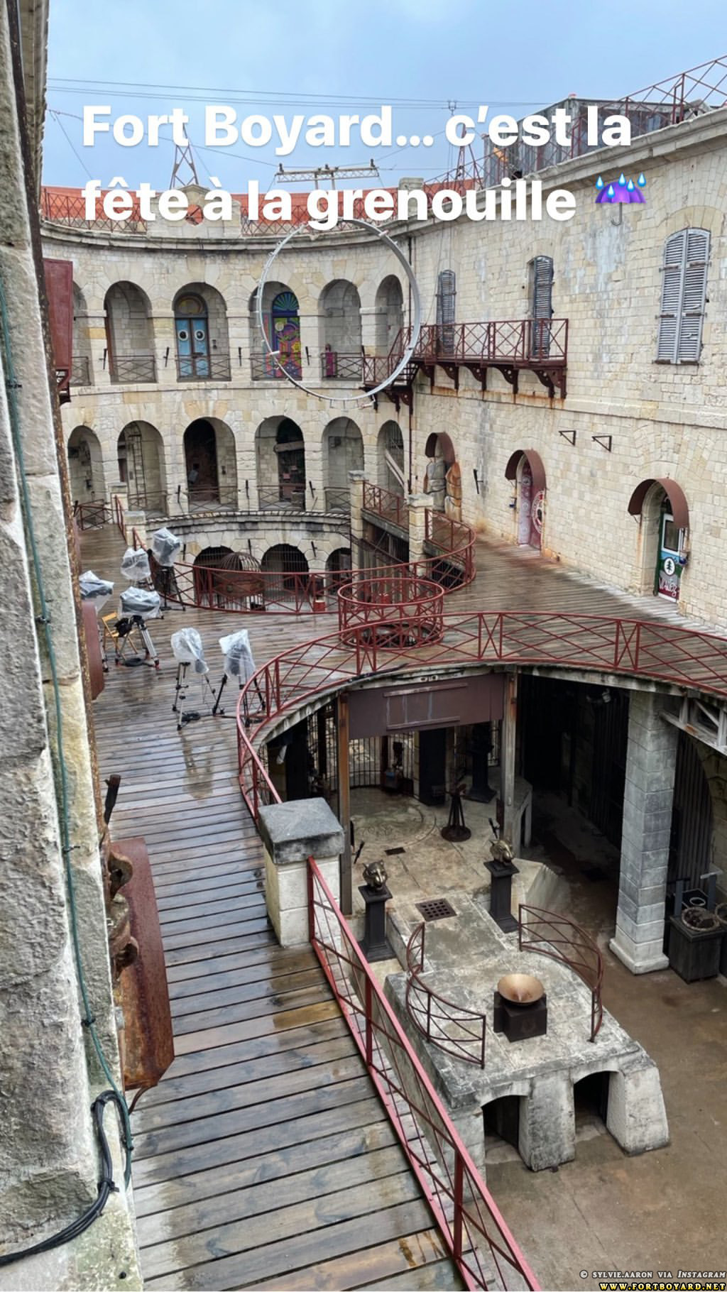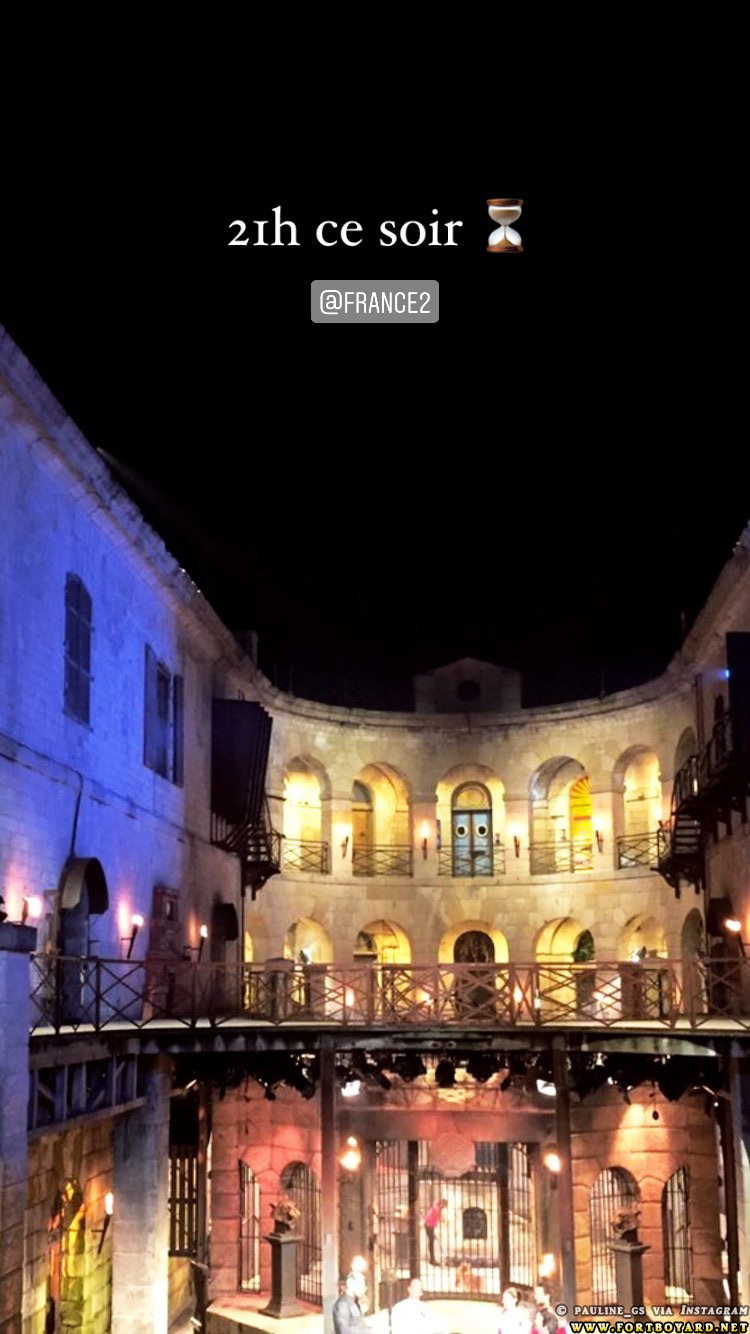Commentaire : Vers 12h50, la maquilleuse Jennifer Guernier, sur son compte Instagram, nous offre une photo de la cour intérieure au rez-de-chaussée du Fort. On peut voir que les écran de part et d’autre du proscenium sont toujours là.