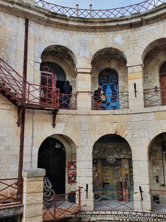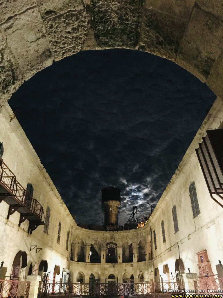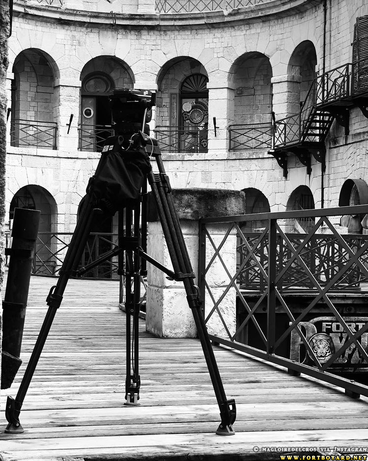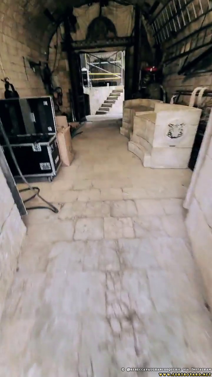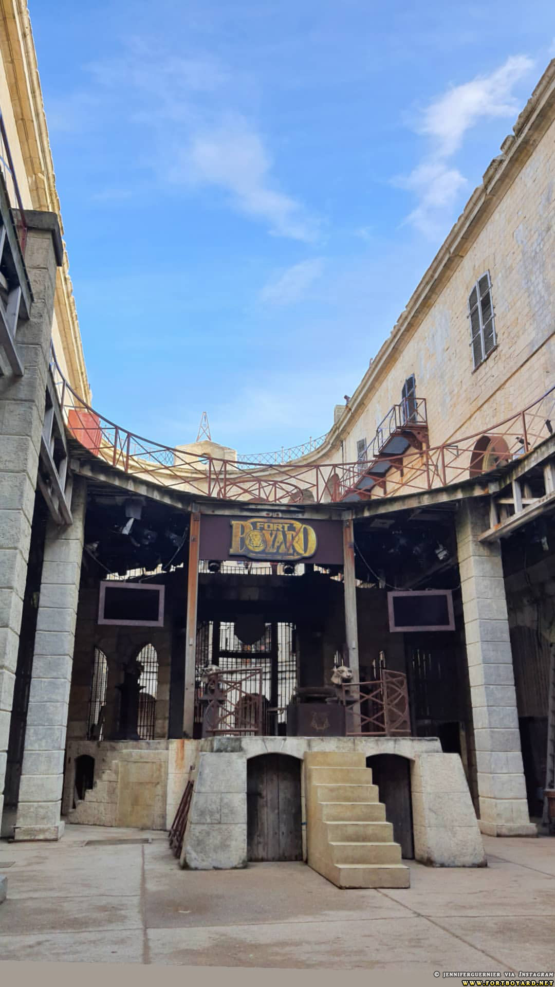 Commentaire : Vers 12h50, la maquilleuse Jennifer Guernier, sur son compte Instagram, nous offre une photo de la cour intérieure au rez-de-chaussée du Fort. On peut voir que les écran de part et d’autre du proscenium sont toujours là.