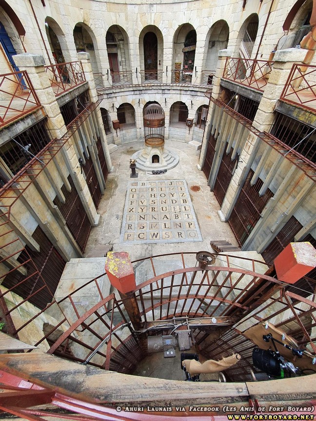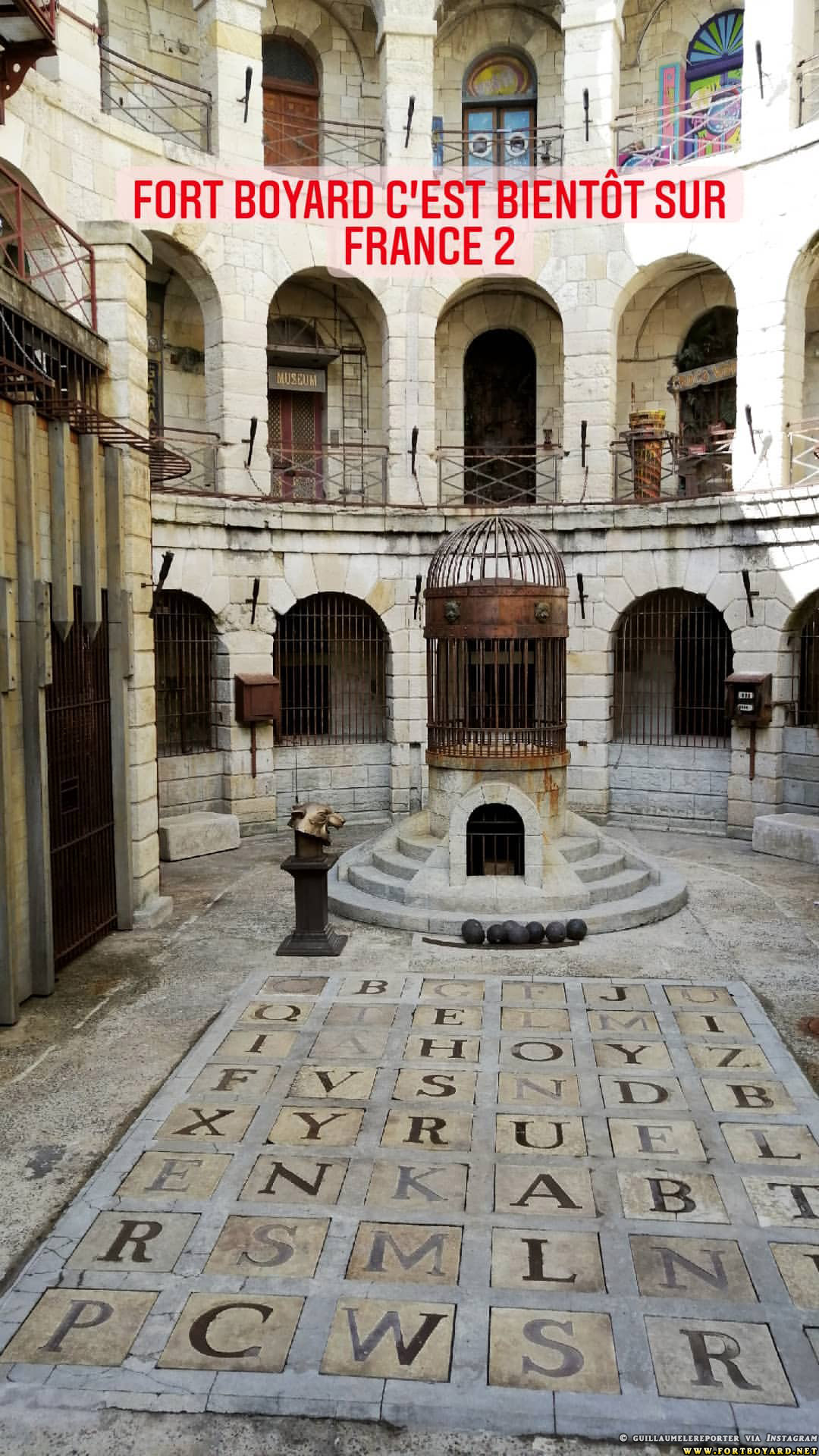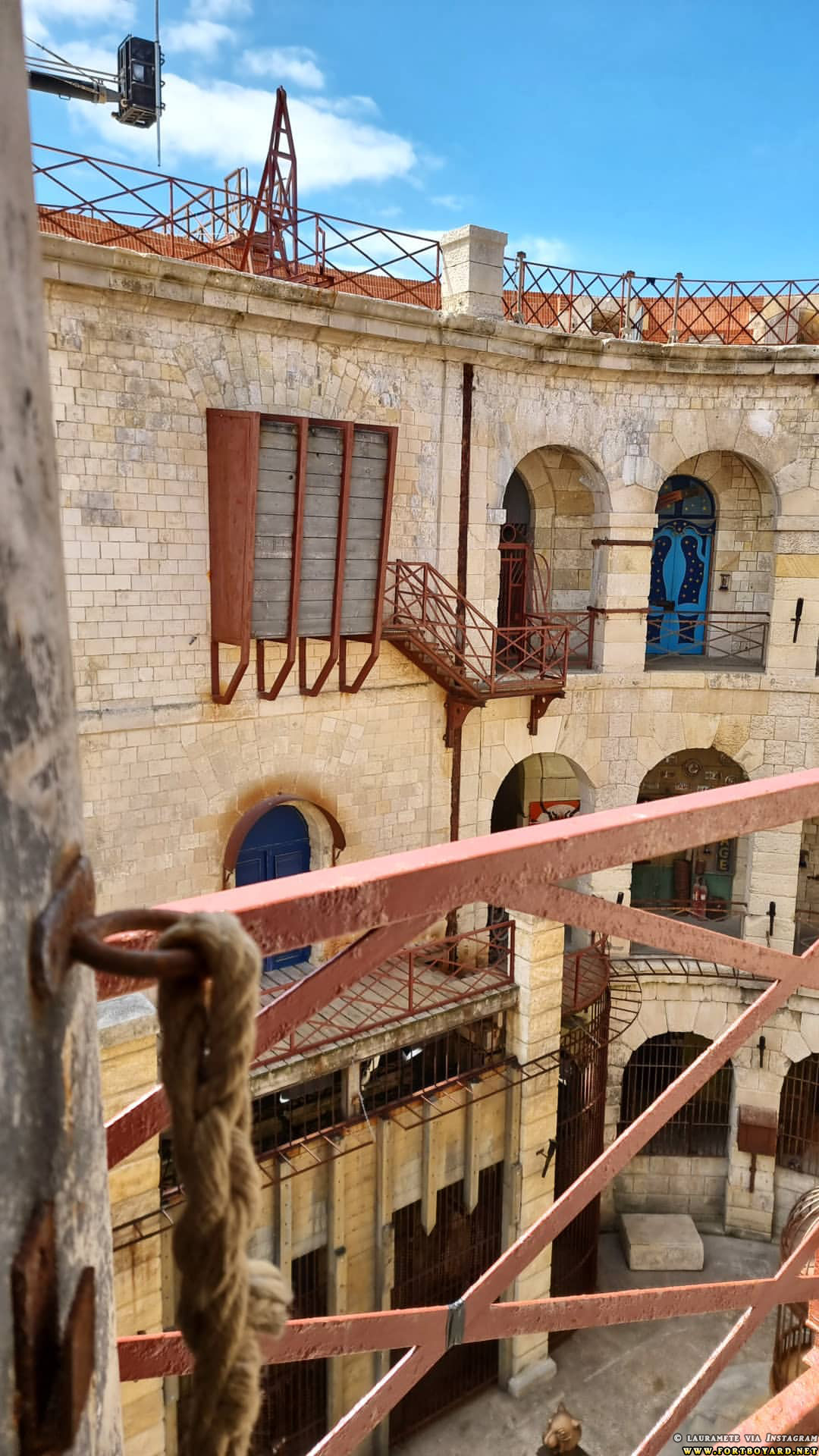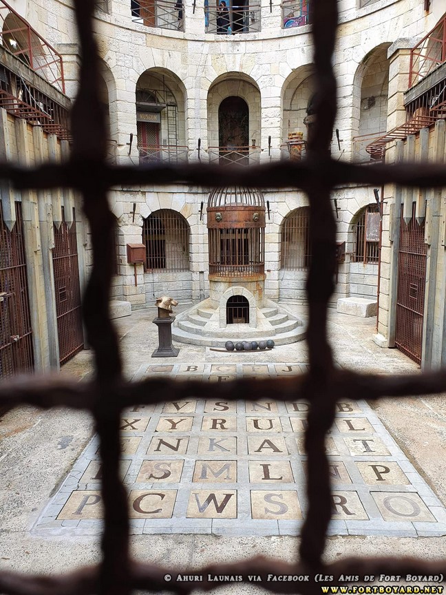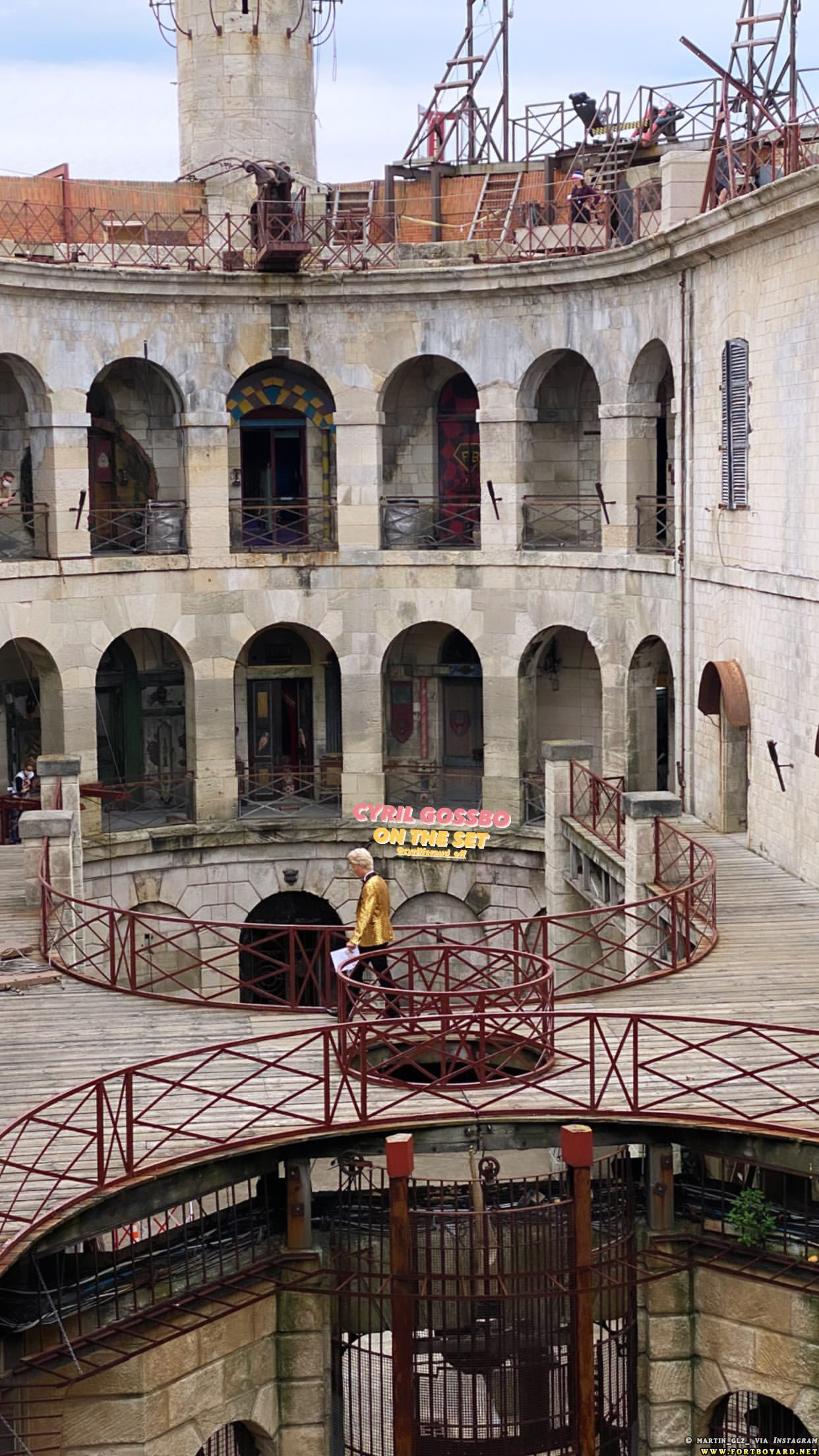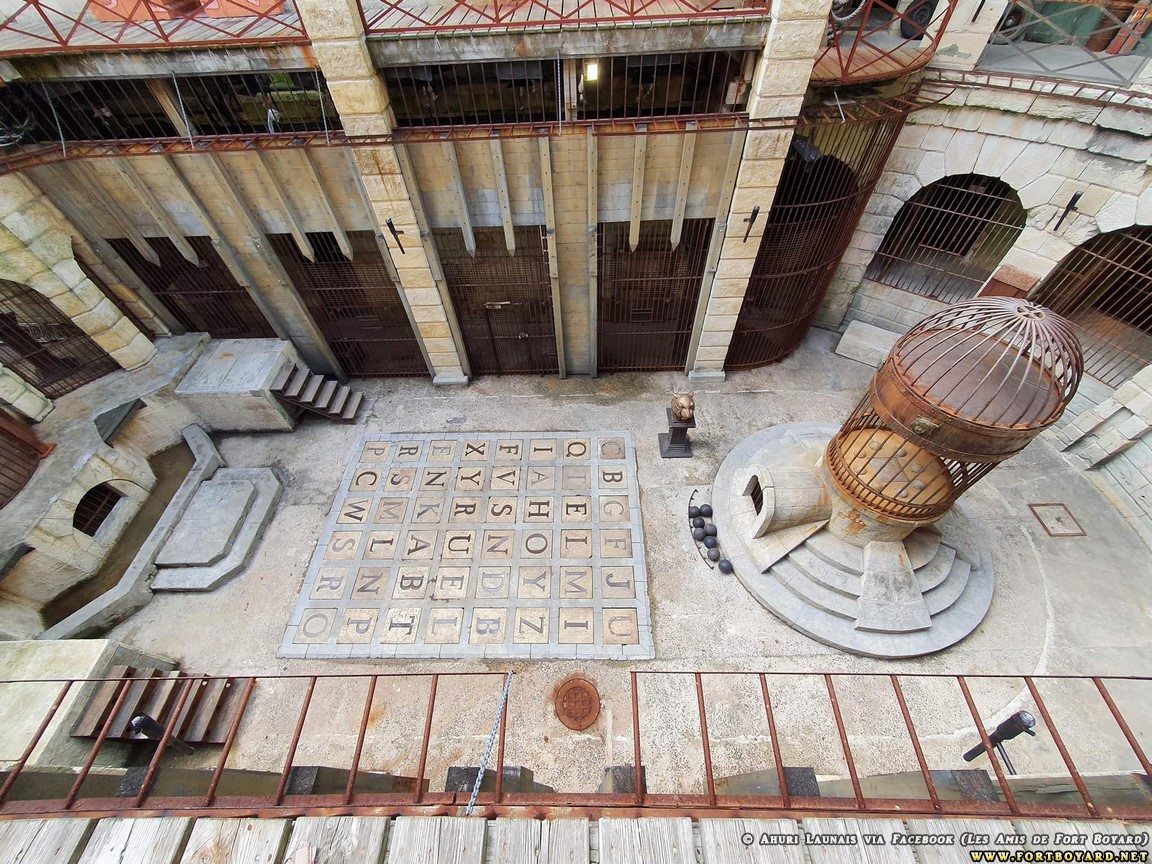 Commentaire : Ahuri Launais, le fils de Pierre Launais, co-créateur de Fort Boyard nous offre de très beaux clichés de sa visite du 11 mai dernier, sur lesquels on peut notamment voir que la nouvelle épreuve en cellule 115 est une maison à l’envers, tandis que l’ancien restaurant de Willy Rovelli en cellule 215 restera fermé et dédié aux coulisses de l’émission (fond vert pour les incrustations). La vigie n’arbore pas non plus le logo de la Boyard Academy, mais un panneau de couleur jaune.