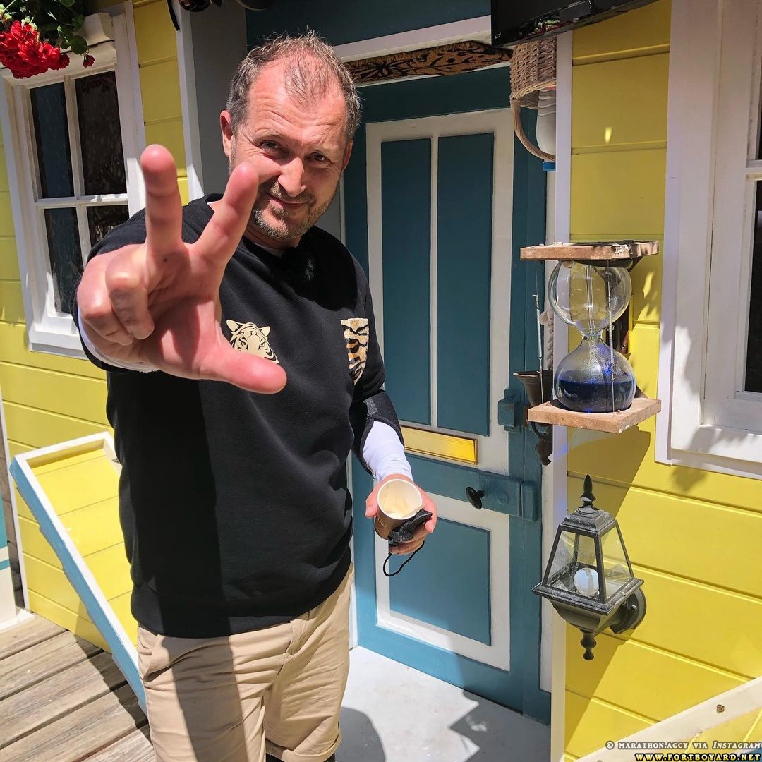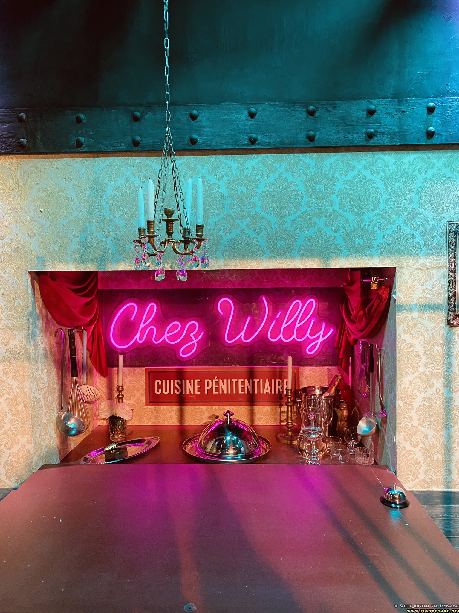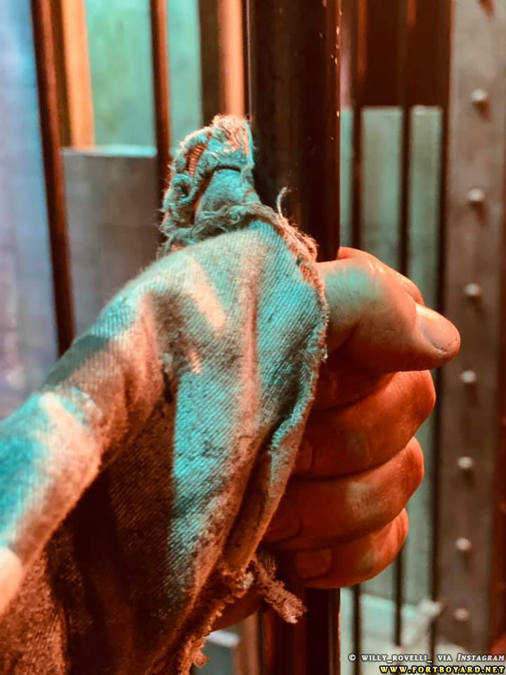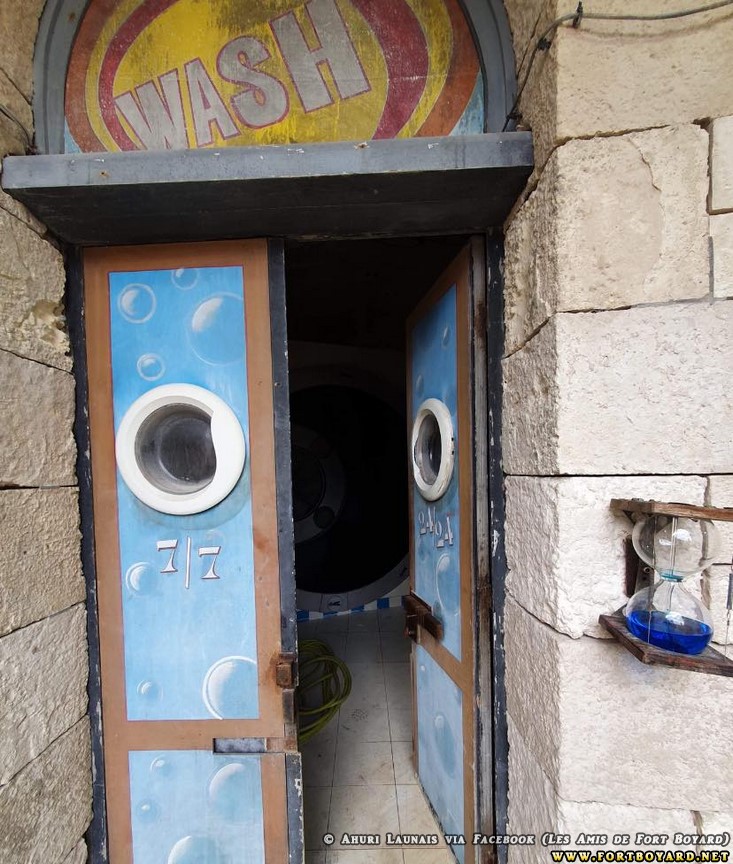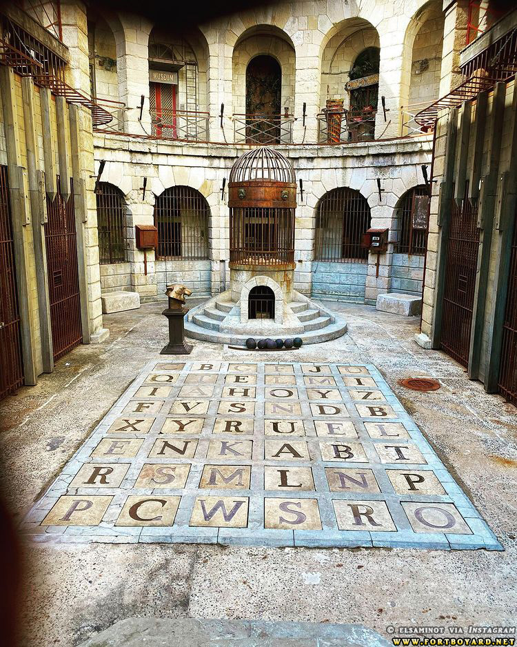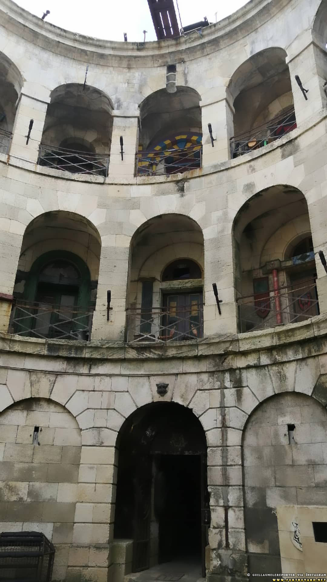 Commentaire : Ahuri Launais, le fils de Pierre Launais, co-créateur de Fort Boyard nous offre de très beaux clichés de sa visite du 11 mai dernier, sur lesquels on peut notamment voir que la nouvelle épreuve en cellule 115 est une maison à l’envers, tandis que l’ancien restaurant de Willy Rovelli en cellule 215 restera fermé et dédié aux coulisses de l’émission (fond vert pour les incrustations). La vigie n’arbore pas non plus le logo de la Boyard Academy, mais un panneau de couleur jaune.
