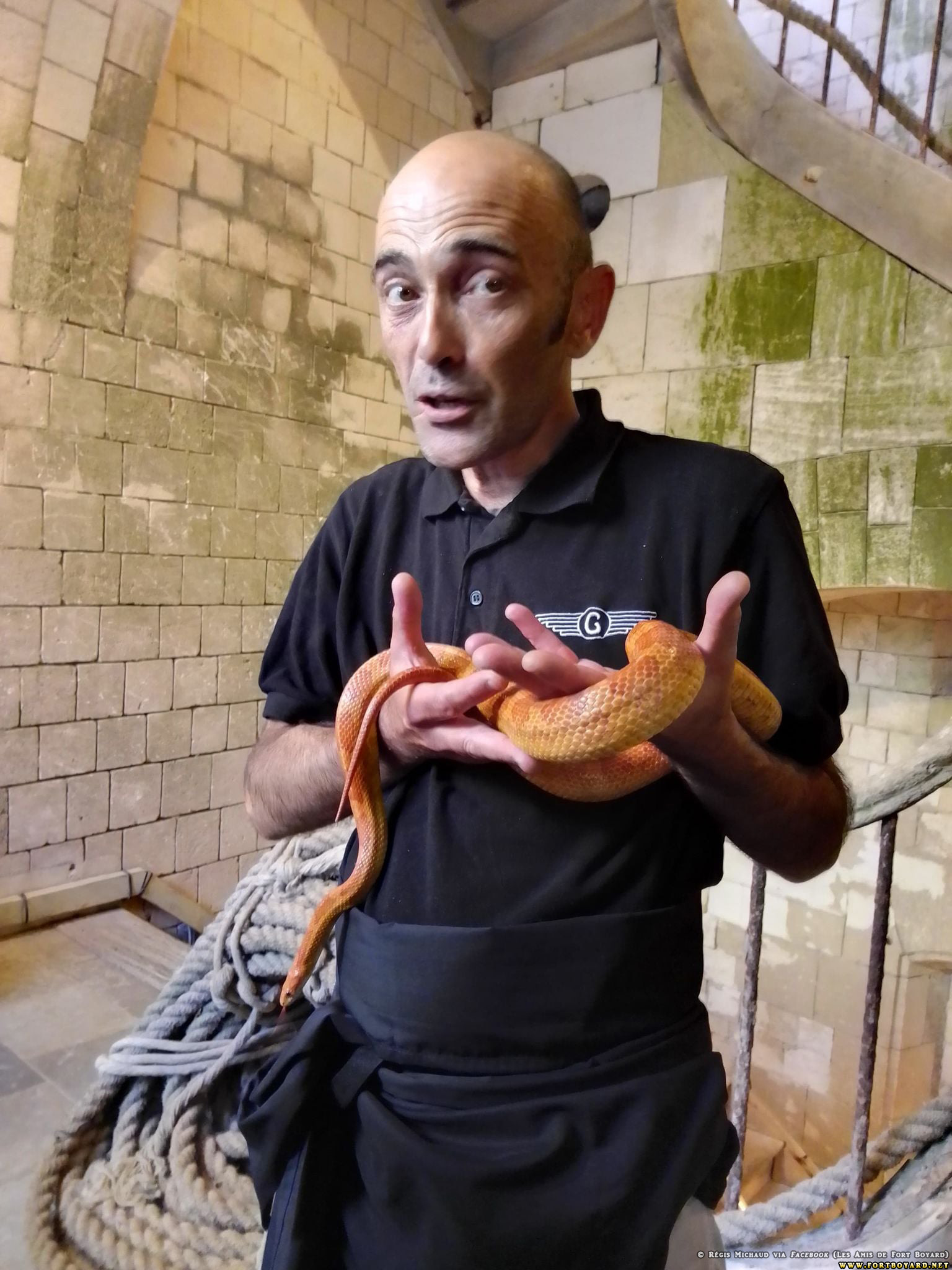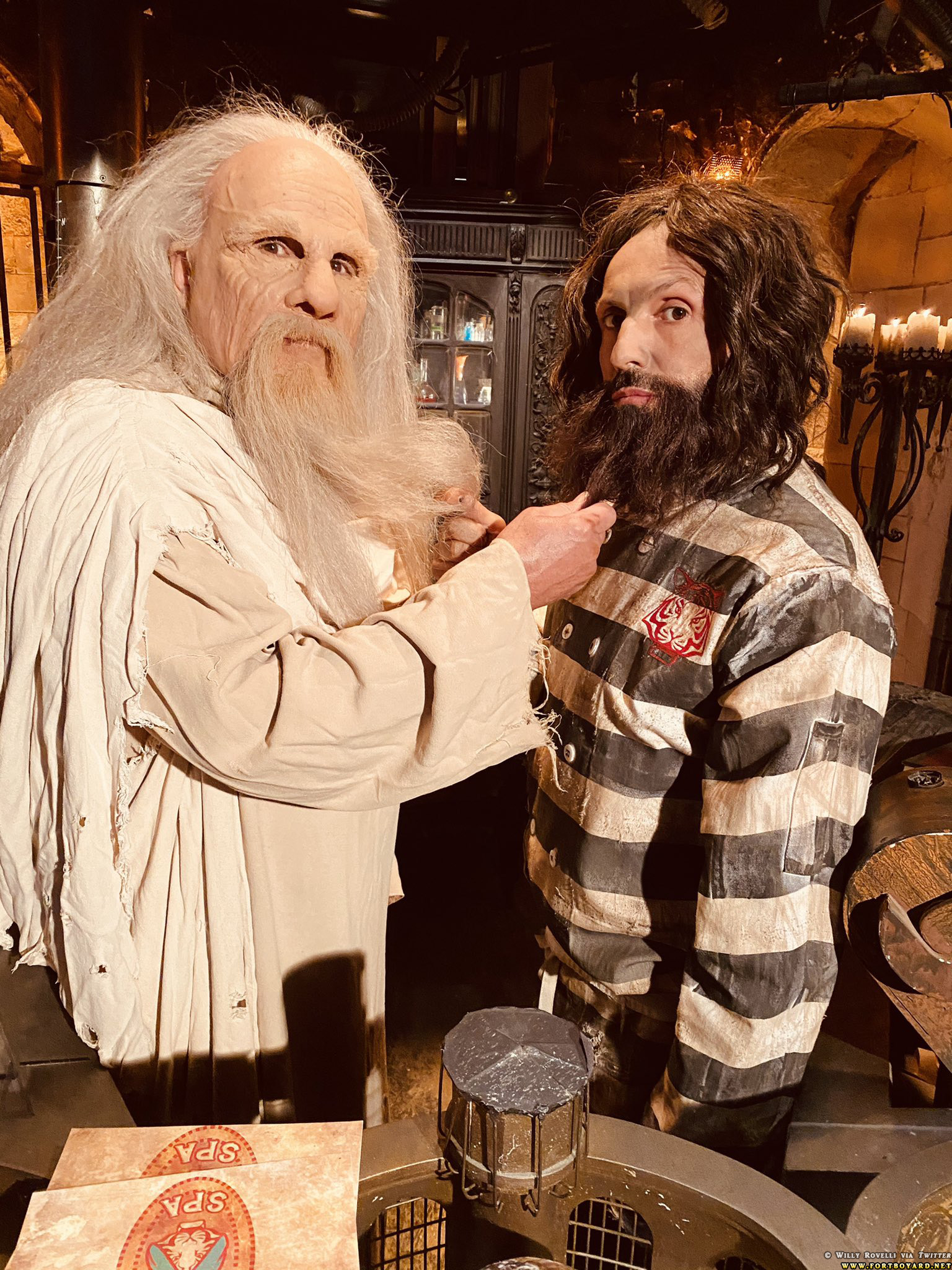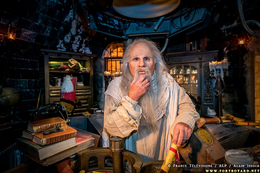 Commentaire : Serge Avril, l’ancien Magicien du Fort entre 2003 et 2013, qui endosse depuis 2016 le costume de Maître du Temps pour affronter un candidat dans son duel du Bonneteau au Conseil nous offre une belle photo de lui en compagnie du Père Fouras qui arborera cette saison un costume un peu rafraîchi pour présider le Conseil. On peut voir notamment deux vestes en velours marron et un médaillon à tête de tigre reprenant l’adage présent à l’entrée du Conseil « In tigris fauces se jectare » (« se jeter dans la gueule du tigre »).