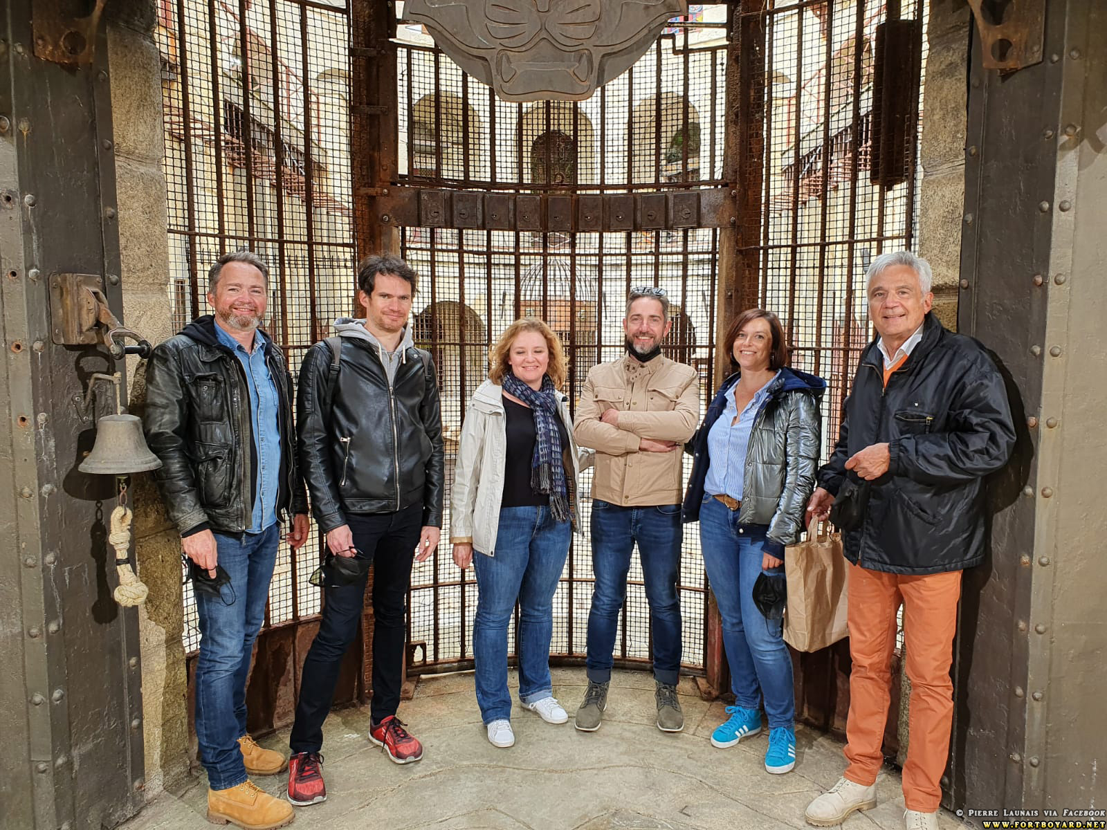 Commentaire : Pierre Launais (complètement à droite sur la photo deux), co-créateur de Fort Boyard avec Jacques Antoine et Jean-Pierre Mitrecey était en visite hier sur le Fort avec son fils et des membres de sa famille proche. On peut remarquer que la grille de la Salle du Trésor est bien composée de 9 serrures servant à accueillir les 9 clés nécessaires à son ouverture.