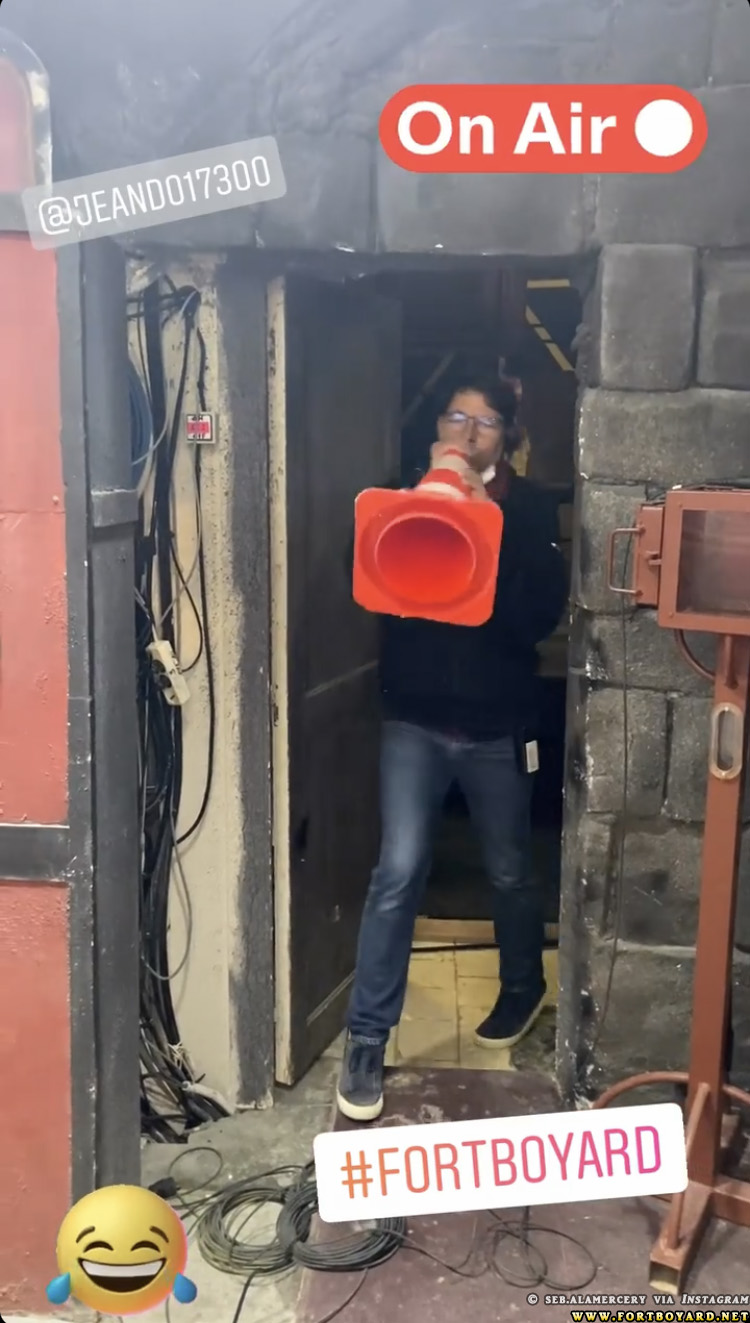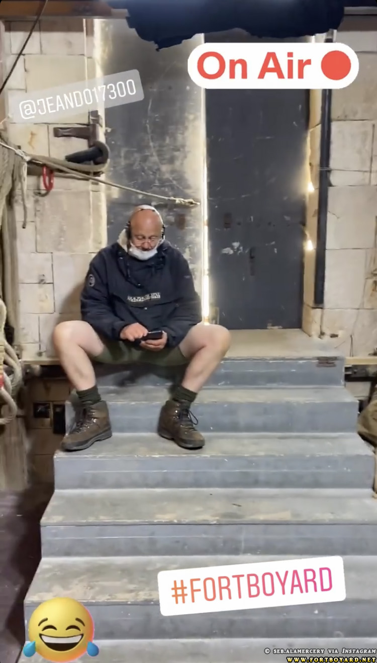 Commentaire : des membres de la production du jeu partagent des photos des tournages sur le Fort. Sur la première, on peut voir le Fort en configuration de tournage pour la deuxième partie de soirée. Le plateau ne change pas avec un fauteuil pour Olivier Minne et un banc et des sièges pour l’équipe. La structure au niveau de la pesée où les candidats doivent glisser leurs mains pour « buzzer » pendant le jeu de Willy Rovelli est également identique aux saisons précédentes.