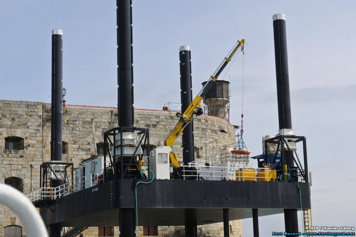 Ce nouvel accès met fin à une nouvelle tranche de travaux, qui a été particulièrement coûteuse, puisque pas moins de 2 millions d’euros, financés par le Conseil départemental, ont été nécessaires pour la construction, l’acheminement et la mise en place de la nouvelle plateforme off-shore, baptisée Banjaert, un mot hollandais signifiant « banc de sable », en référence à celui sur lequel est posé le Fort, et qui avait été cartographié pour la première fois par un hollandais en 1585. La longe de Boyard avait alors été appelée « Ban Iaert » (« le banc »), un mot qui au fil des siècles a donné celui de Boyard.