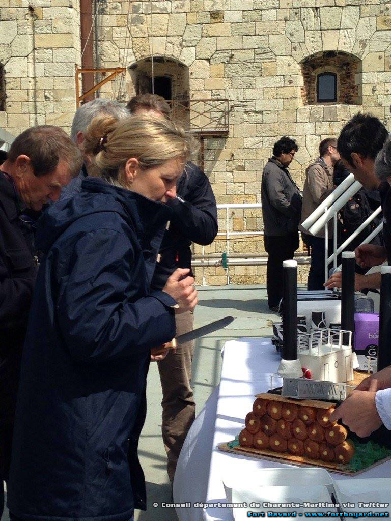 C’est la maire de Fouras, Sylvie Marsilly, qui avait été désignée marraine de cette nouvelle plateforme, et qui l’a donc inaugurée vendredi en sabrant le champagne sur l’un de ses massifs pylônes. Etaient aussi présents Dominique Bussereau, Président du Département de la Charente-Maritime, ainsi que quelques journalistes. Une pièce montée, arborant des éléments de la nouvelle plateforme, ainsi qu’un buffet, ont permis de célébrer comme il se doit ce petit événement dans l’histoire de la Forteresse.