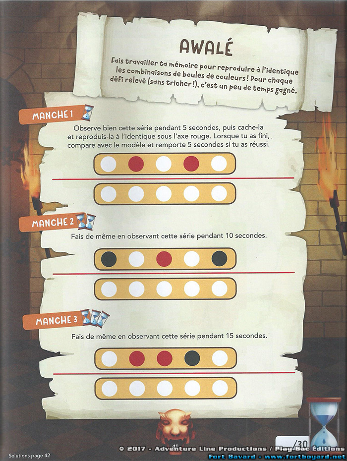- Le Jugement : « pour libérer les prisonniers de ton équipe, tu as rendez-vous avec Blanche ». Le cahier part du postulat que pendant les épreuves il y a eu des prisonniers. Il s’agit donc de les délivrer en réalisant des jeux d’adresse et de hasard. Dans cette partie, il n’y a rien à gagner.