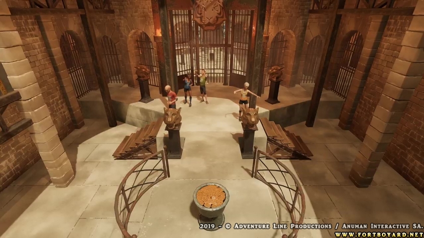 Et justement, venons-en à la fin de la partie. Vous arrivez sur le proscenium, la liste de vos indices s’affiche sur la droite, et il vous faut choisir dans une liste de quatre propositions laquelle est le bon mot-code. Là encore, on ne vous demande pas de taper votre idée de mot-code directement... C’est à ce moment-là, alors que le temps s’écoule, que vous pouvez aussi choisir de faire un ou des sacrifices. Une fois le mot-code « sélectionné » parmi les quatre propositions, vos personnages s’installent eux-mêmes sur l’alphabet géant de la Salle du Trésor. Mais comble du ridicule, la tête de tigre se tourne toute seule, sans l’action de Félindra, grande absente du jeu, ou même d’un autre personnage pour la remplacer... La magie du Fort sans doute. Si vous avez trouvé la bonne réponse, les boyards tombent dans la fontaine, et vous devez aller les ramasser en vous rapprochant de la fontaine et en actionnant les flèches du clavier pour les amasser. Attention, si vous percutez un de vos coéquipiers alors que vous avez des boyards dans les mains, alors vous en perdrez une quantité non négligeable. De même, si vous restez derrière la grille de la Salle du Trésor à la fin du temps imparti, vous aurez une pénalité. Une fois bien chargé, il ne vous reste plus qu’à sortir de la Salle du Trésor pour déposer les boyards dans le chaudron sur le proscenium. À la fin du temps, la pesée est effectuée directement et le résultat s’affiche sur un cadran à tête de tigre sur la droite du proscenium, alors qu’il se trouve à l’étage dans l’émission. On peut regretter que cette partie finale soit bâclée, car globalement la méthode de saisie des boyards était assez réaliste, comparée à celle pour laquelle avait opté Mindscape dans le précédent jeu vidéo...