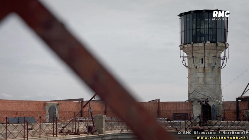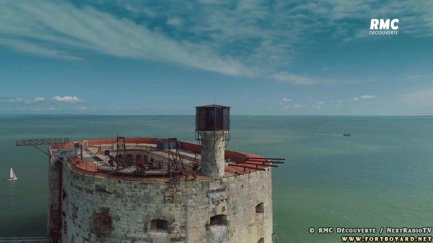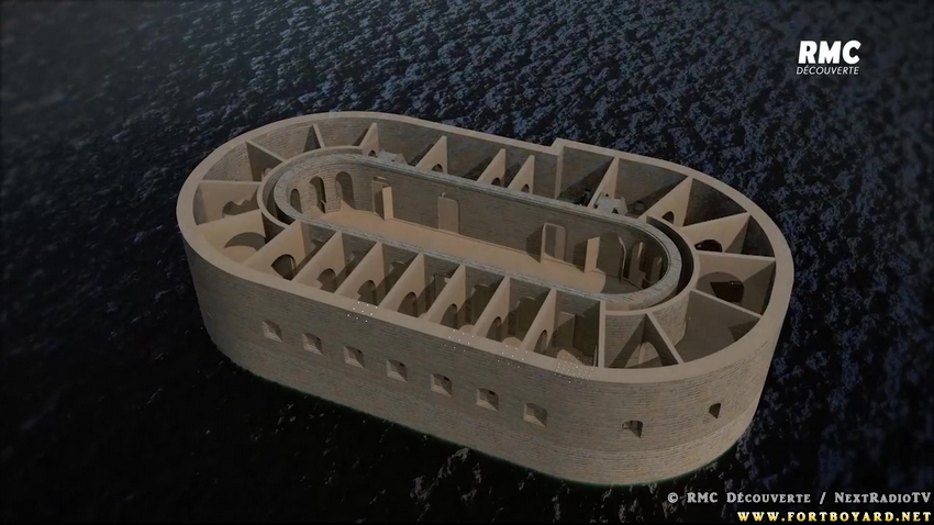 Voix off : « Entre 300 et 500 ouvriers se sont relayés nuit et jour sur ce chantier hors norme. Pour dévier les boulets de canon tirés à son encontre le Fort adoptera la forme d’une ellipse de cinq niveaux ouverte sur une cour intérieure. Conçu comme un navire de guerre, le Fort Boyard doit pouvoir fonctionner en parfaite autonomie. Au sous-sol des soutes permettent de stocker le charbon, les munitions et les vivres et une énorme citerne retient jusqu’à 325 000 litres d’eau potable. Au rez-de-chaussée, des bureaux, une cuisine, une prison, des magasins d’artillerie et douze canons seront installés. Les premier et deuxième étages seront dédiés aux logements d’une garnison qui comptera jusqu’à 260 hommes en temps de guerre. Enfin, au sommet du Fort, une terrasse est conçue comme une véritable plateforme d’artillerie : 18 canons de 36 mm y seront installés sur des rails de pivotement. Point culminant de l’édifice, une tour de vigie construite à 29 m de hauteur permettra de surveiller le large sur près de 19 km de distance ».
