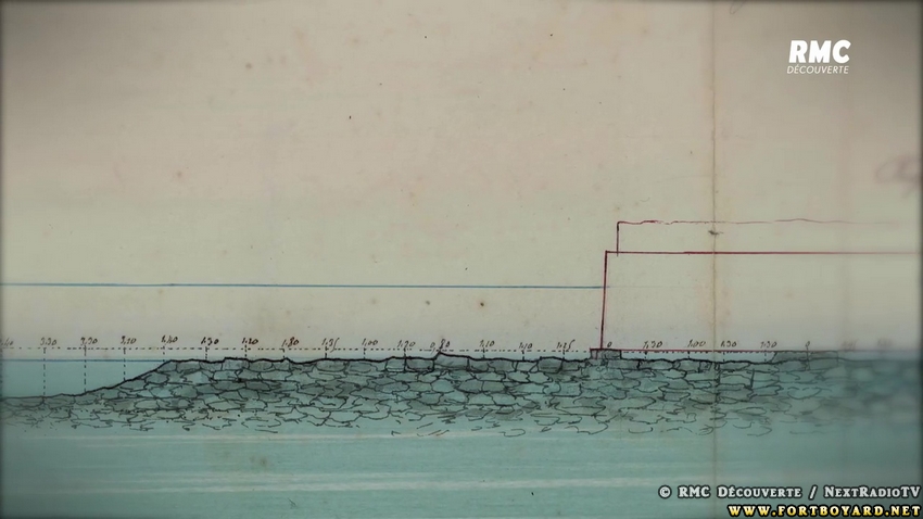 Voix off : « tout comme à Cherbourg, c’est donc la technique dite des pierres perdues qui est choisie. Des tonnes de pierres sont déversées sur le bac de sable afin de créer un enrochement suffisamment solide et découvert à marée basse. Sur ce tas de cailloux, trois assises en pierres de taille seront assemblées pour former une base de 100 m de long sur 50 de large sur laquelle viendra se poser l’édifice ».